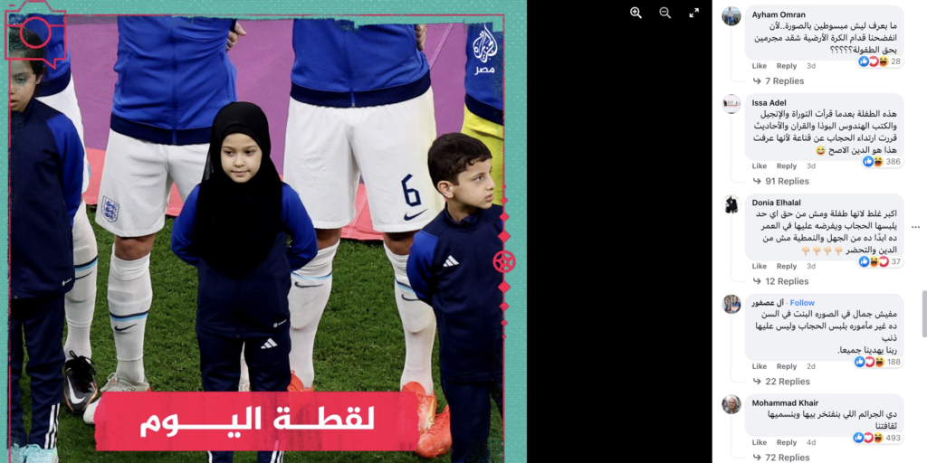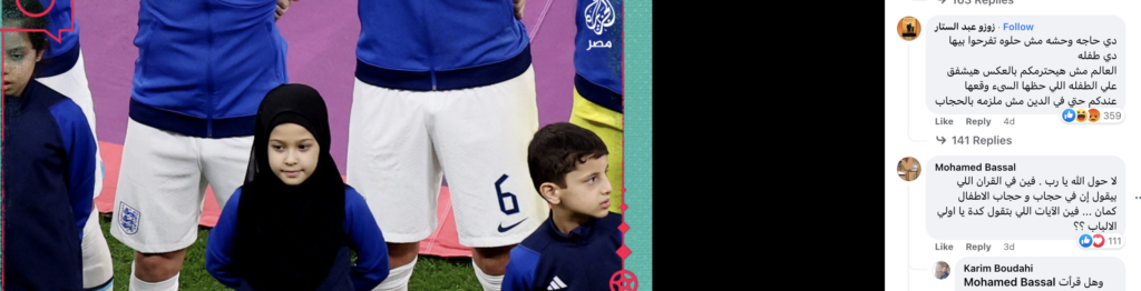 اللافت للنظر أن الإعلام الشبه الرسمي الممثل بالجزيرة، وقنوات بن سبورت[4] القطرية لم تركز على صور ايفانا أو غيرها من المشجعات الجميلات السافرات، بل جرى التركيز على صورة فتاة عربية محجبة شاركت اللاعبين الإنكليز خلال عزف نشيد بلادهم الوطني، وخصّة قنوات الجزيرة هذه الصورة بعبارة “لقطة اليوم”[5]، في إشارة من القناة التي طالما روجت لحركات الإسلام السياسي إلى أن الحجاب للفتيات أمر طبيعي، وعلى العالم أن يتقبله.